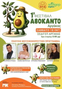 Το 1ο Φεστιβάλ Αβοκάντο έρχεται στην Κύπρο και συγκεκριμένα στην Αργάκα, το Σάββατο 18 Οκτωβρίου 2025, στο χώρο της ΣΕΔΙΓΕΠ Αργάκας, με ώρα έναρξης τις 17:00. Πρόκειται για μια μεγάλη γιορτή αφιερωμένη στο αγαπημένο superfood, που θα συνδυάσει γεύσεις, μουσική και παράδοση.