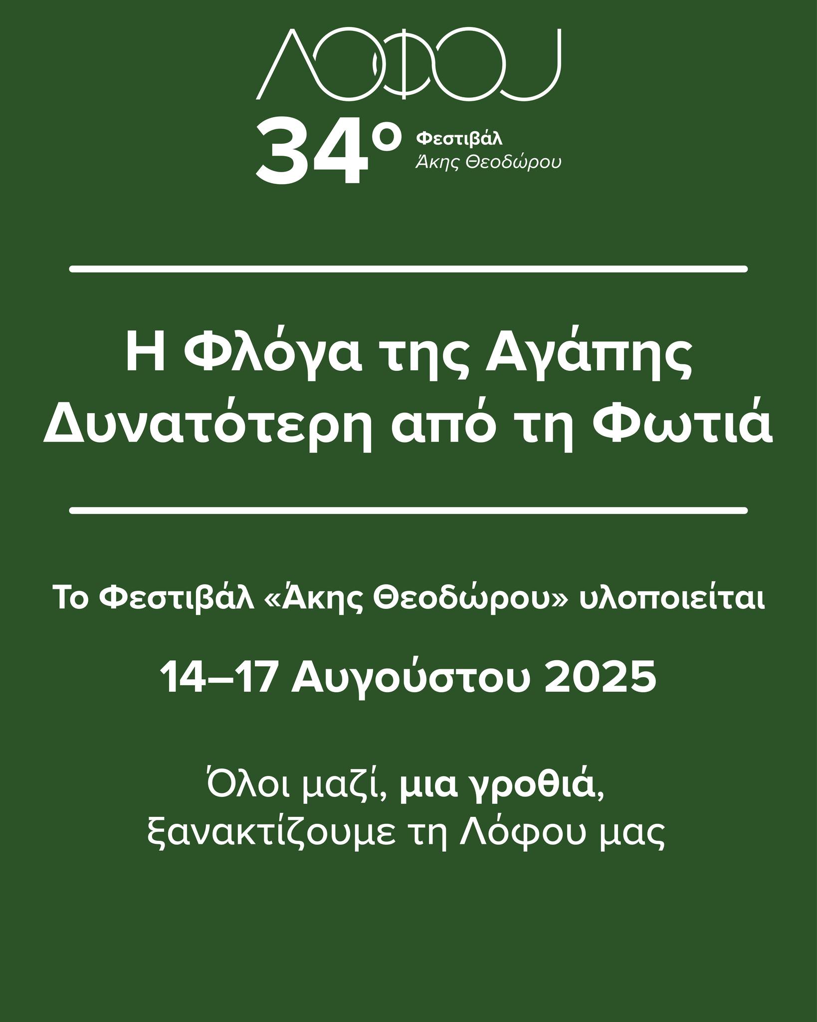 Το 34ο Φεστιβάλ «Άκης Θεοδώρου» στην καμένη – πλέον Λόφου, αναμένεται να πραγματοποιηθεί κανονικά στις 14 μέχρι τις 17 Αυγούστου 2025, σύμφωνα με τους διοργανωτές, τον Σύνδεσμο Αποδήμων Λόφου.