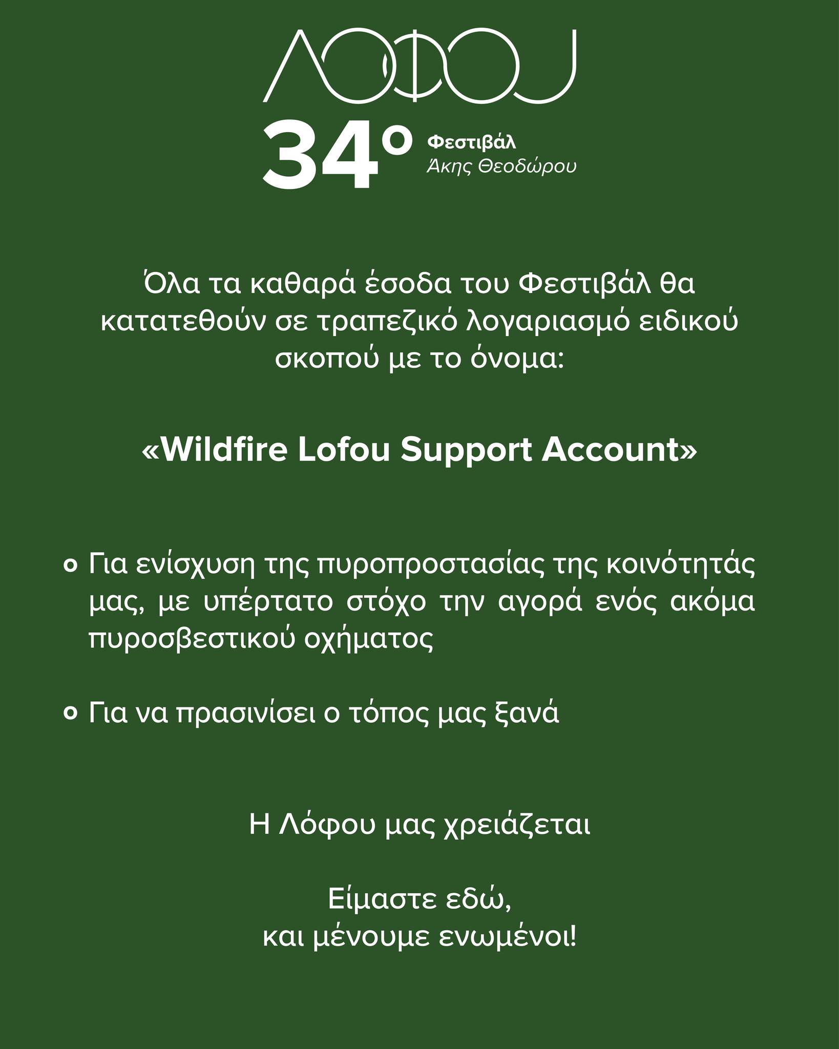 - Το άνοιγμα τραπεζικού λογαριασμού ειδικού σκοπού με το όνομα «Wildfire Lofou Support Account» προς υλοποίηση των προαναφερθέντων δύο στόχων, όπου θα μεταφερθούν τόσο τα καθαρά έσοδα του Φεστιβάλ, όσο και οι όποιες εισφορές από οργανωμένα σύνολα, επιχειρήσεις και φυσικά πρόσωπα.