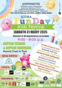 Το Δημοτικό Διαμέρισμα Σωτήρας του Δήμου Αγίας Νάπας γιορτάζει την Παγκόσμια Ημέρα Παιδιού με το 1ο FunDay Kids Festival. Με ελεύθερη είσοδο και πολλές δραστηριότητες, είναι το ιδανικό απόγευμα για δημιουργική απασχόληση και διασκέδαση.