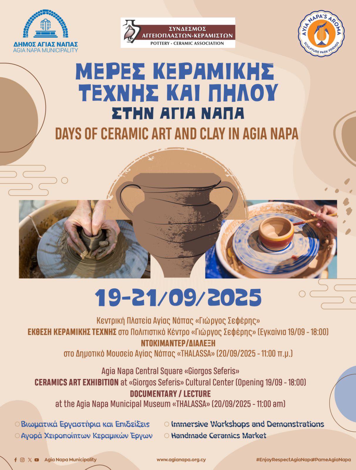 Το Δημοτικό Διαμέρισμα Αγίας Νάπας σε συνεργασία με τον Σύνδεσμο Αγγειοπλαστών-Κεραμιστών και τον Σύνδεσμο «Αρωμα» Φίλοι Πάρκου Γλυπτικής Αγίας Νάπας διοργανώνουν για πρώτη φορά τις «Μέρες Κεραμικής Τέχνης και Πηλού» από τις 19 έως τις 21 Σεπτεμβρίου 2025 στην Κεντρική Πλατεία Αγίας Νάπας «Γιώργος Σεφέρης».