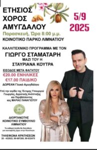 Γι’ αυτό λοιπόν και το Κοινοτικό Συμβούλιο Λιμνατίου Λεμεσού διοργανώνει και μας προσκαλεί στον Ετήσιο Χορό Αμυγδάλου που θα πραγματοποιηθεί την Παρασκευή 05 Σεπτεμβρίου στο Κοινοτικό Πάρκο Λιμνατίου στις 20:00.