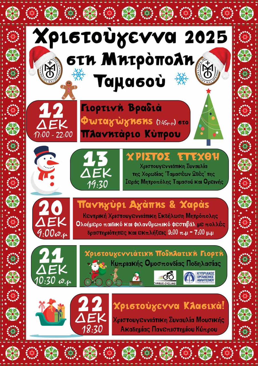 Η Μητρόπολη Ταμασού παρουσιάζει ένα από τα πληρέστερα και πιο λαμπερά χριστουγεννιάτικα προγράμματα της Κύπρου για το 2025, με πέντε μεγάλες εκδηλώσεις που απευθύνονται σε όλες τις ηλικίες και συνδυάζουν μουσική, φιλανθρωπία, παιδικές δραστηριότητες και εορταστική ατμόσφαιρα.