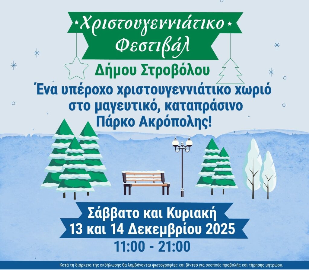 Ένα μαγευτικό χριστουγεννιάτικο χωριό θα «ανθίσει» στο καταπράσινο Πάρκο Ακρόπολης, το Σαββατοκύριακο 13 και 14 Δεκεμβρίου 2025, φιλοξενώντας το Χριστουγεννιάτικο Φεστιβάλ του Δήμου Στροβόλου.