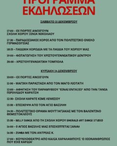 Την Κυριακή 14 Δεκεμβρίου από τις 10:00 π.μ., το πρόγραμμα περιλαμβάνει λιοτατή, θεατρικά δρώμενα, χορούς, επιδείξεις, παιχνίδια, γλυκά και φαγητό, δημιουργώντας μια ολοκληρωμένη εμπειρία για όλη την οικογένεια.