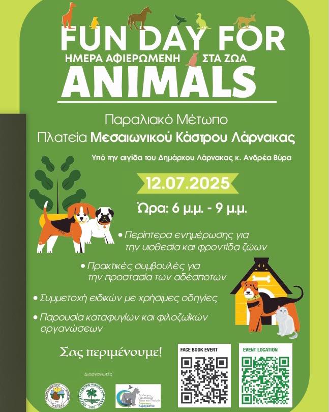Εκδήλωση αφιερωμένη στην ευημερία και την προστασία των ζώων, υπό τον τίτλο: «Fun Day for animals» – «Ημέρα Αφιερωμένη στα Ζώα», διοργανώνουν η Περιβαλλοντική Κίνηση Κύπρου, το Περιβαλλοντικό Κίνημα Λάρνακας και ο Σύνδεσμος Προστασίας Ζώων και Πουλιών Λάρνακας – Αμμοχώστου, το Σάββατο 12 Ιουλίου 2025.