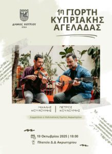 18:00 Συναυλία παραδοσιακής μουσικής με τους Μιχάλη και Πέτρο Κουλουμή, με τη συμμετοχή του Πολιτιστικού Ομίλου Ακρωτηρίου.