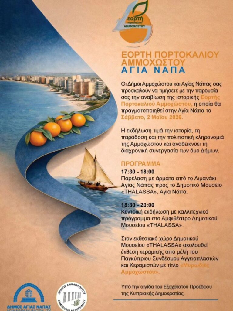 Η Εορτή του Πορτοκαλιού αναβιώνει το Σάββατο 2 Μαΐου 2026 στην Αγία Νάπα, μέσα από μια πρωτοβουλία του Δήμου Αγίας Νάπας και του Δήμου Αμμόχωστος, που στοχεύει στη διατήρηση της ιστορικής μνήμης και της πολιτιστικής ταυτότητας της περιοχής.