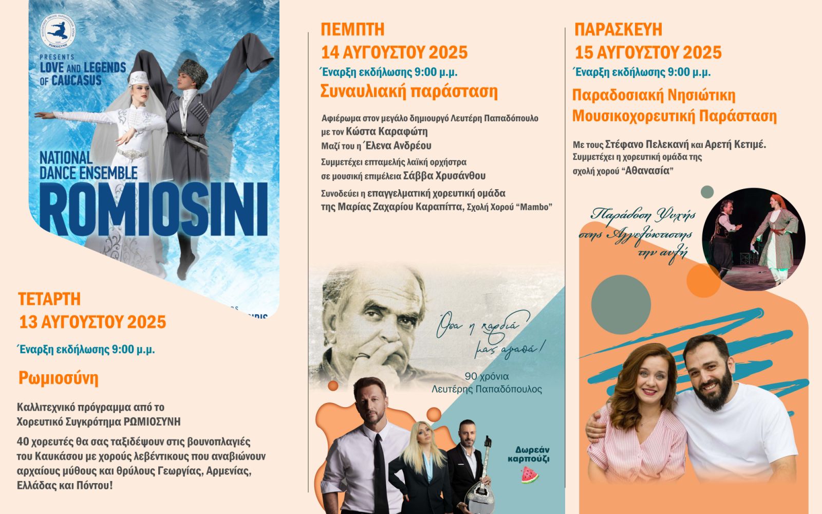 Ακολουθεί, την Τετάρτη 13 Αυγούστου, στις 21:00 καλλιτεχνικό πρόγραμμα από το χορευτικό συγκρότημα «ΡΩΜΙΟΣΥΝΗ».  40 χορευτές θα ταξιδέψουν τους θεατές στις βουνοπλαγιές του Καυκάσου με χορούς λεβέντικους που αναβιώνουν αρχαίους μύθους και θρύλους από Γεωργία, Αρμενία, Ελλάδα και Πόντο!