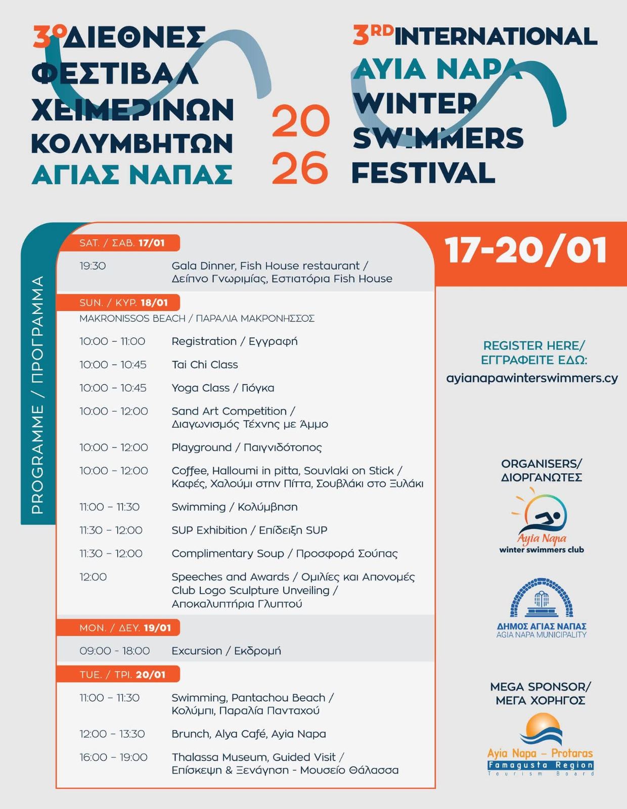 Από το Σάββατο 17 Ιανουαρίου έως την Τρίτη 20 Ιανουαρίου 2026, η Αγία Νάπα θα γεμίσει ζωντάνια και δράση με το 3ο Διεθνές Φεστιβάλ Χειμερινών Κολυμβητών!  Το φεστιβάλ, που συνδιοργανώνεται από τον Δήμο Αγίας Νάπας και τον Όμιλο Χειμερινών Κολυμβητών Αγίας Νάπας, αποτελεί πλέον θεσμό και γιορτή της χειμερινής κολύμβησης.