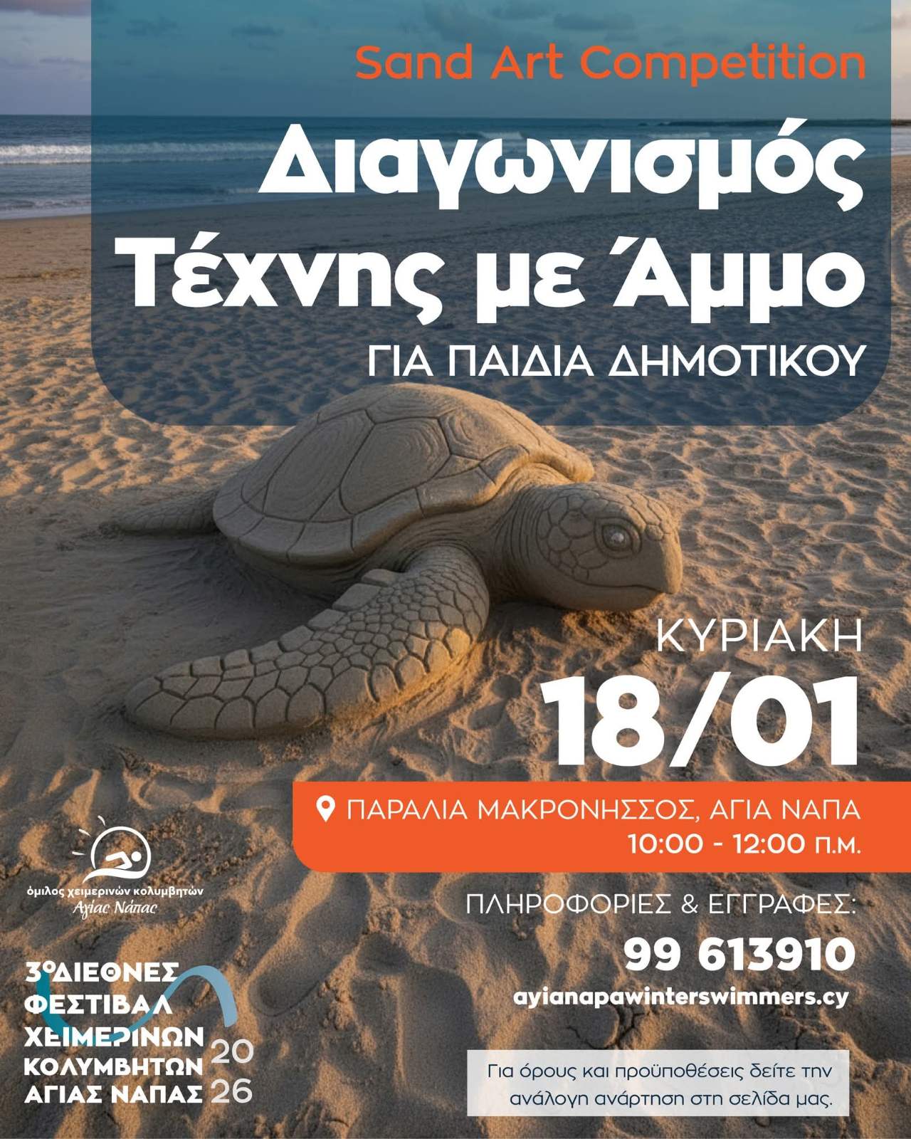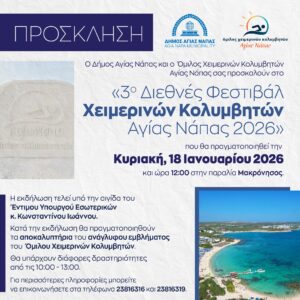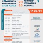 Από το Σάββατο 17 Ιανουαρίου έως την Τρίτη 20 Ιανουαρίου 2026, η Αγία Νάπα θα γεμίσει ζωντάνια και δράση με το 3ο Διεθνές Φεστιβάλ Χειμερινών Κολυμβητών! Το φεστιβάλ, που συνδιοργανώνεται από τον Δήμο Αγίας Νάπας και τον Όμιλο Χειμερινών Κολυμβητών Αγίας Νάπας, αποτελεί πλέον θεσμό και γιορτή της χειμερινής κολύμβησης.