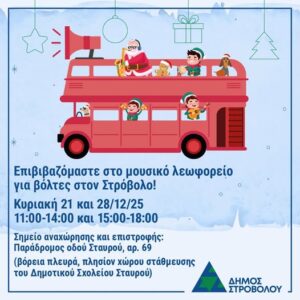 Ο Δήμος Στροβόλου διοργανώνει για τις εορτές των Χριστουγέννων το Μουσικό Λεωφορείο, μια ξεχωριστή εμπειρία που συνδυάζει βόλτα στην πόλη με ζωντανή μουσική.