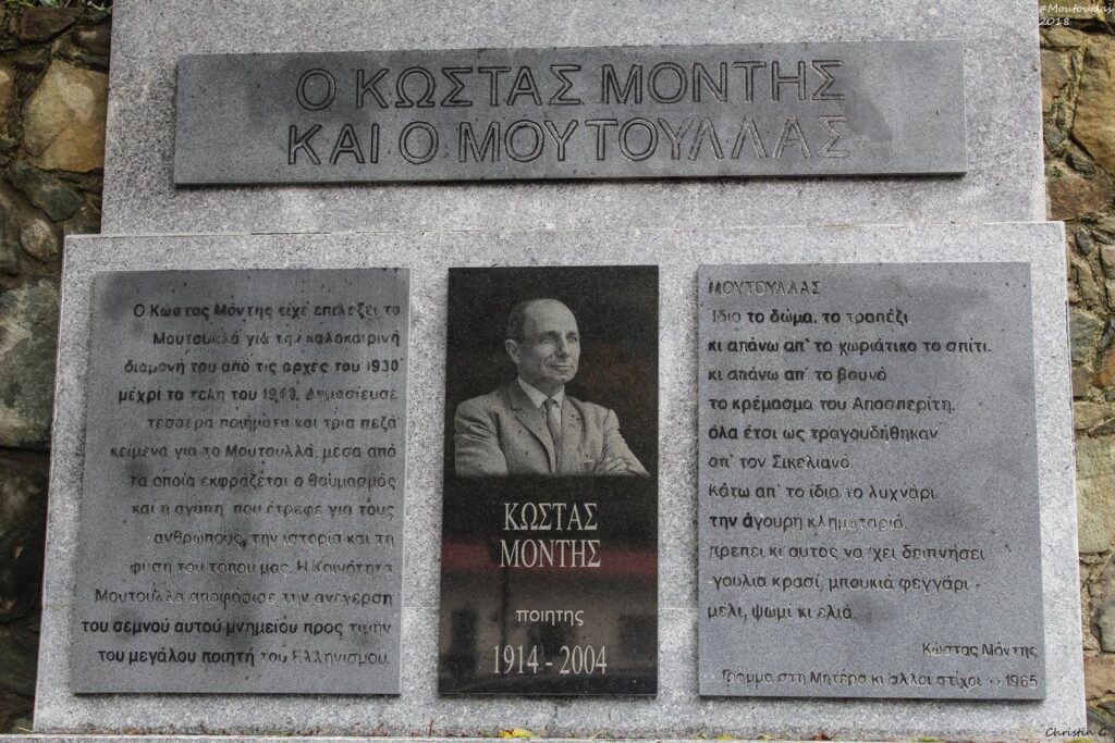 Συνολικά τέσσερα ποιήματα και τρία πεζά έγραψε ο Μόντης αφιερωμένα στον Μουτουλλά, ενώ στην κοινότητα έχει ανεγερθεί ένα σεμνό μνημείο προς τιμή του Κώστα Μόντη, ως ένδειξη σεβασμού προς το πρόσωπό του.  Μάλιστα, το 2014, στην κοινότητα Μουτουλλά ανακηρύχθηκε το «Έτος Μόντη».  Συγκεκριμένα, το Κοινοτικό Συμβούλιο Μουτουλλά και ο Σύνδεσμος Αποδήμων της κοινότητας τίμησαν τον ποιητή διοργανώνοντας μία μεγάλη εκδήλωση τον Ιούνιο του 2014.