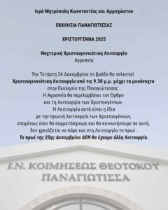 Την Τετάρτη 24 Δεκεμβρίου, το βράδυ, θα τελεστεί Νυχτερινή Χριστουγεννιάτικη Λειτουργία – Αγρυπνία, από τις 9:30 μ.μ. έως τα μεσάνυχτα. Η Αγρυπνία θα περιλαμβάνει τον Όρθρο και τη Θεία Λειτουργία των Χριστουγέννων.