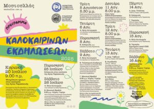 Οι καλοκαιρινές εκδηλώσεις ξεκίνησαν από την Κυριακή 20 Ιουλίου και ολοκληρώνονται το Σάββατο 16 Αυγούστου με τη μεγάλη χοροεσπερίδα.