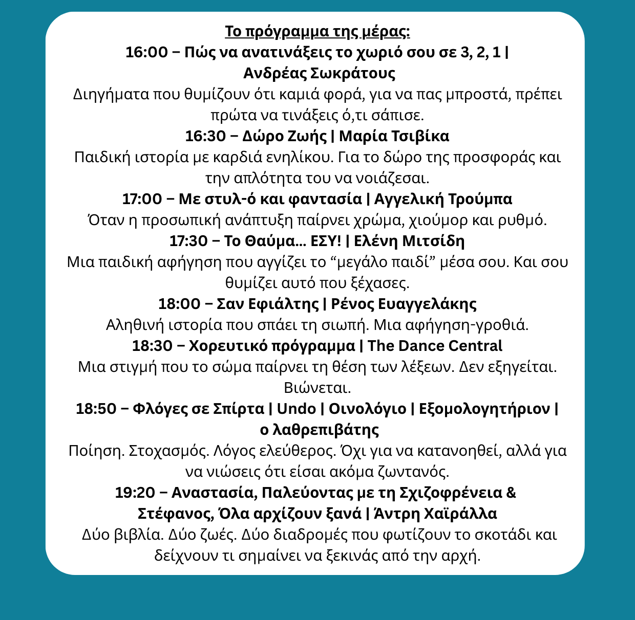 «Δεν χρειάζεται να είσαι «βιβλιοφάγος» για να περάσεις καλά. Δεν χρειάζεται να έχεις «λόγο» για να έρθεις. Απλώς ακολούθησε την επιθυμία να νιώσεις κάτι διαφορετικό.