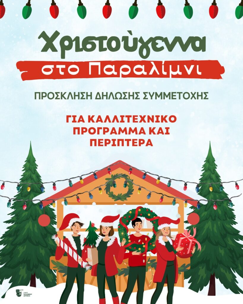 Ο Δήμος Παραλιμνίου – Δερύνειας προσκαλεί όσους επιθυμούν να υποβάλουν προτάσεις για καλλιτεχνικό πρόγραμμα και λειτουργία περιπτέρου κατά τις Χριστουγεννιάτικες εκδηλώσεις που θα πραγματοποιηθούν στο Δημοτικό Διαμέρισμα Παραλιμνίου κατά τον Νοέμβριο και Δεκέμβριο του 2025.