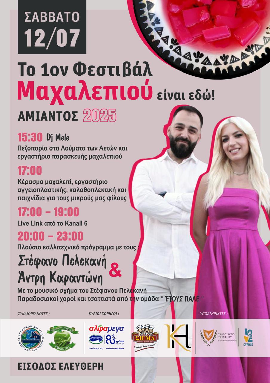 Ένα ακόμη ενδιαφέρον φεστιβάλ με γεύσεις παράδοσης το οποίο ανακοινώθηκε πολύ πρόσφατα, είναι αυτό που θα γίνει στο χωριό Αμίαντος της ορεινής Λεμεσού, το Σάββατο 12 Ιουλίου 2025 και θα έχει βασικό πρωταγωνιστή… το αγαπημένο μαχαλεπί.