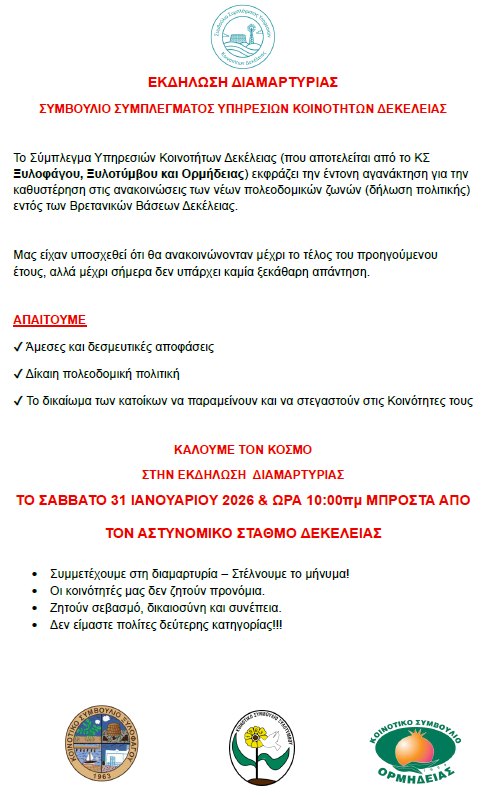 Σε ανακοίνωσή του, το Σύμπλεγμα – το οποίο αποτελείται από τις κοινότητες Ορμήδεια, Ξυλοτύμβου και Ξυλοφάγου – αναφέρει ότι, παρά τις δεσμεύσεις για ανακοίνωση της δήλωσης πολιτικής σχετικά με τις νέες πολεοδομικές ζώνες εντός των Βρετανικών Βάσεων Δεκέλειας έως το τέλος του προηγούμενου έτους, δεν έχει υπάρξει μέχρι σήμερα οποιαδήποτε ξεκάθαρη ενημέρωση ή απάντηση από τις αρμόδιες αρχές.