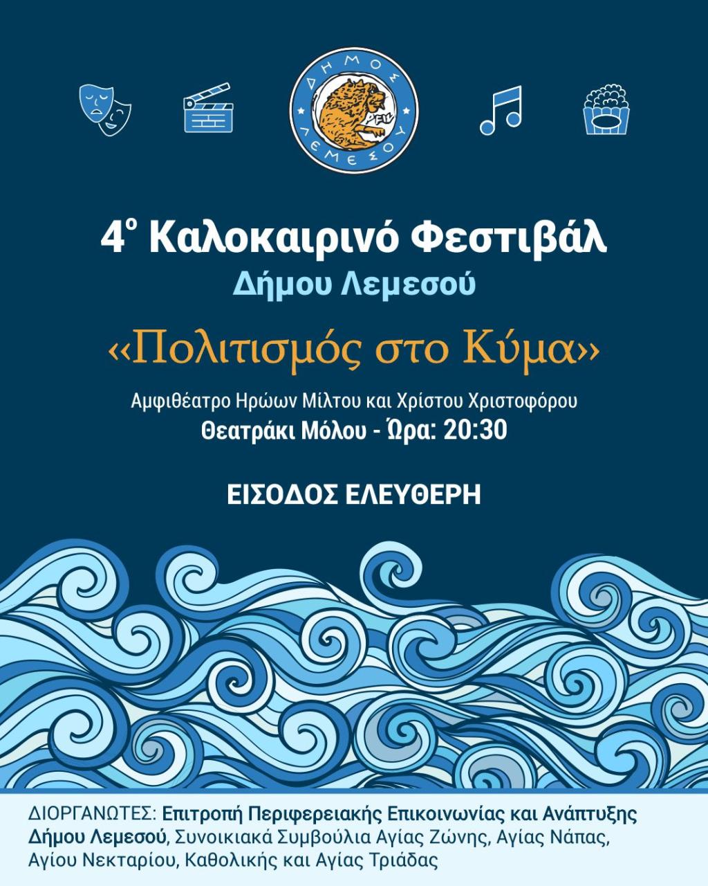 Κι αυτό το καλοκαίρι η Επιτροπή Περιφερειακής Επικοινωνίας και Ανάπτυξης του Δήμου Λεμεσού παρουσιάζει το 4ο Καλοκαιρινό Φεστιβάλ «Πολιτισμός στο Κύμα» με μια πληθώρα παραστάσεων, προβολών και συναυλιών.