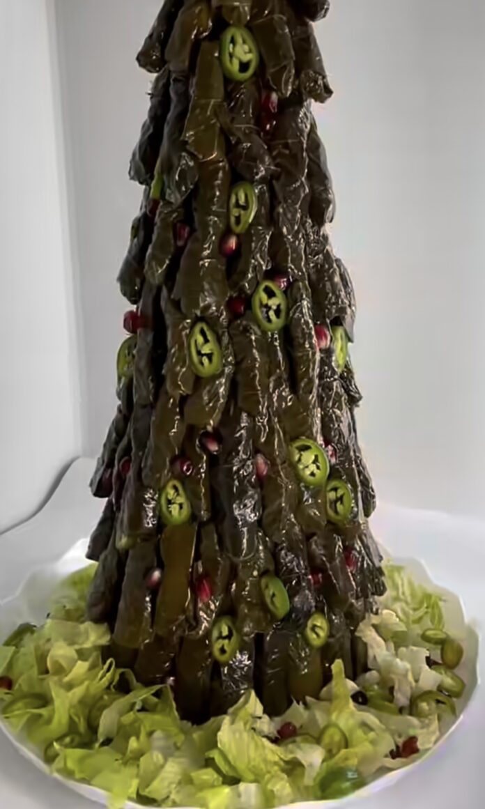 Αυτό είναι ένα Χριστουγεννιάτικο δέντρο φτιαγμένο εξολοκλήρου από κουπέπια — στολισμένο με ρόδια και πράσινες πιπεριές, με μια λαμπερή κορυφή-αστέρι.