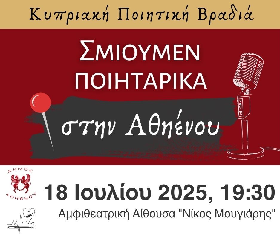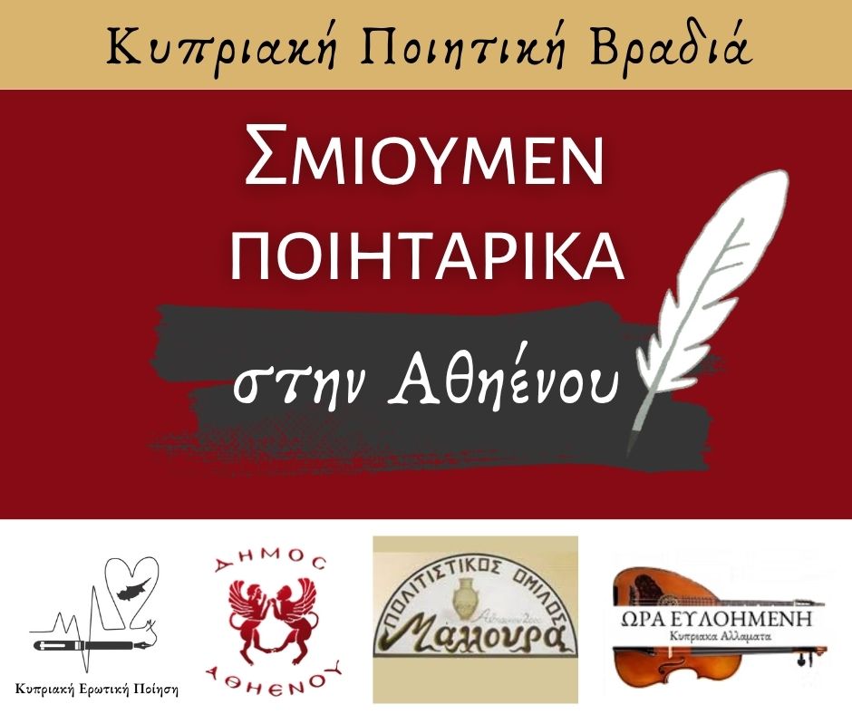 Όπως αναφέρουν, πρόκειται για την πιο ζωντανή Κυπριακή Ποιητική Βραδιά του φετινού καλοκαιριού και φέρει ως τίτλο «Σμίουμεν Ποιητάρικα στην Αθηένου». Σημειώνεται ότι η εκδήλωση δεν έχει διαγωνιστικό χαρακτήρα.