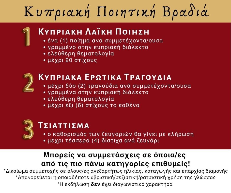 Αν είστε και εσείς λάτρεις της κυπριακής λαϊκής ποίησης, του τσιαττίσματος και των ερωτικών τραγουδιών, μπορείτε να λάβετε μέρος επιλέγοντας μία (ή περισσότερες) από τις παρακάτω τρεις κατηγορίες: