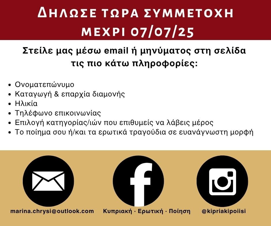 Συμμετοχές μέχρι τις 07/07/2025 μέσω email: [email protected] ή μήνυμα στη σελίδα Κυπριακή · Ερωτική · Ποίηση με: